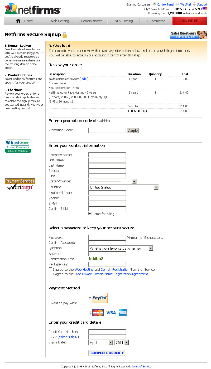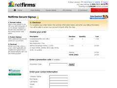 Netfirms’s Sign-Up application allows new customers to purchase web hosting packages and domain registrations. PHP sessions, HTML forms, AJAX, and some DOM scripting are used to facilitate the registration process. The bulk of the logic for handling errors and dealing with each registration step is centralized for use by multiple sign-up paths.